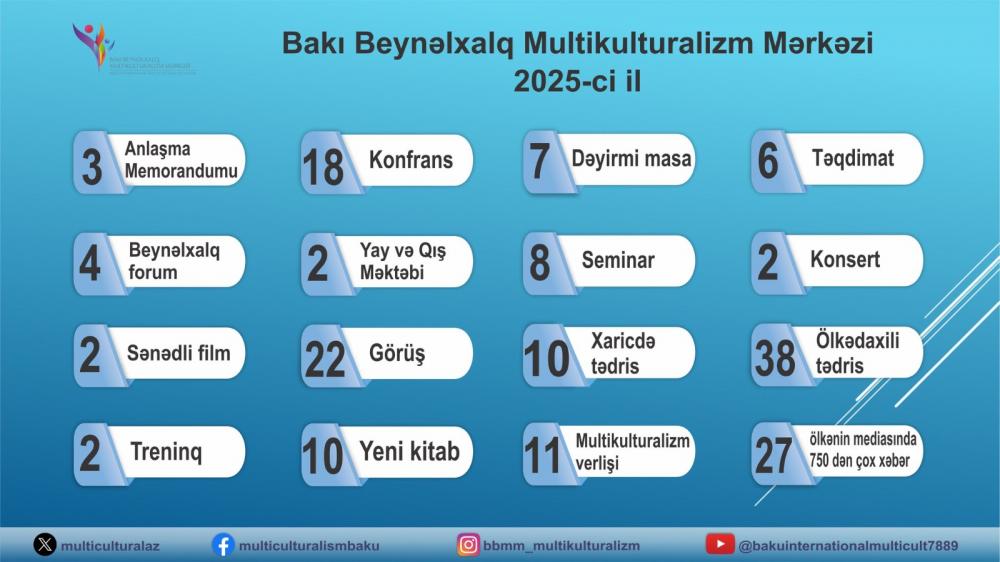 Bakı Beynəlxalq Multikulturalizm Mərkəzi (BBMM) 2025-ci ildə həm yerli, həm də beynəlxalq müstəvidə intensiv və çoxşaxəli fəaliyyət göstərib. Mərkəz il ərzində multikulturalizmin təbliği, islamofobiya və antisemitizmlə mübarizə, dağıdılmış mədəni irsin qorunması və bərpası, Qərbi azərbaycanlıların qayıdış hüququnun gündəmdə saxlanılması, eləcə də neokolonyalizmə qarşı mübarizə istiqamətlərində ardıcıl layihələr reallaşdırıb və nüfuzlu beynəlxalq platformalarda Azərbaycanın multikulturalizm modelini təqdim edib. Hesabat ilində BBMM-in təşkilatçılığı və iştirakı ilə 18 yerli və beynəlxalq konfrans keçirilib, Mərkəzin beynəlxalq fəaliyyəti isə 15 ölkəni əhatə edib. Bu konfranslar arasında Bakıda 15 mart – İslamofobiya ilə Beynəlxalq Mübarizə Gününün 3-cü ildönümünə həsr olunan “İslamofobiya: Qərəzin ifşa olunması və stiqmaların dağıdılması” beynəlxalq elmi konfransı, Vatikanda Müqəddəs Taxt-Tacın Qriqorian Pontifik Universitetində keçirilmiş “Azərbaycanda xristianlıq: tarix və müasirlik” mövzusunda Qafqaz Albaniyası irsinə həsr edilən XII beynəlxalq elmi konfrans, həmçinin Belçikanın Brüssel şəhərində “Belçika və Avropada 2025 İslam Dünyası İli” çərçivəsində keçirilən “Multikulturalizm modelləri – Münasibətlərin qurulması və sülh şəraitində birgəyaşayış modelləri haqqında düşüncələr” mövzusunda tədbir xüsusi yer tutur. BBMM eyni zamanda “Heydər Əliyev: Multikulturalizm və tolerantlıq ideologiyası” mövzusunda VIII beynəlxalq elmi konfransın da həmtəşkilatçısı olub. Mərkəzin təmsil olunduğu digər beynəlxalq toplantılara Hindistanın Şri-Şri Universitetində “Azərbaycan multikulturalizm modeli” mövzusunda mühazirə, “Dini azadlıqdan dini məsuliyyətə” adlı ikinci beynəlxalq konfrans, Avropa Komissiyası və Avropa Şurasının Brüsseldə təşkil etdiyi müsəlmanlara qarşı nifrət və irqiçilik üzrə əlaqələndirmə konfransı, “Azərbaycanşünaslığın aktual məsələləri: Yeni dövrün Azərbaycanı” XVI beynəlxalq elmi konfransı, “Davamlı sülhün əldə edilməsində dini liderlərin rolu” mövzusunda beynəlxalq konfrans və “İslamofobiya: Mövcud qlobal kontekstdə konsepsiya və təcrübə” adlı beynəlxalq toplantı daxildir. Gürcüstanın Tiflis şəhərində Qafqaz kürdlərinin II elmi-praktiki beynəlxalq konfransında, “Mədəni irs və qayıdış hüququ: Ermənistandan didərgin salınmış azərbaycanlıların mədəni irsinin bərpası – ədalətə, barışığa və sülhə aparan yol kimi” mövzusunda III beynəlxalq konfransda, Cənubi Afrikanın Keyptaun şəhərində “Fəaliyyətdə humanizm: Həssas icmalar diqqət mərkəzində” adlı G20 Dinlərarası Dialoq Forumunda, eləcə də Tunis Beynəlxalq Simpoziumunda (“Beynəlxalq sülh və təhlükəsizliyin dəstəklənməsində BMT-nin Sivilizasiyalar Alyansının rolunun aktivləşdirilməsi” mövzusunda) BBMM-in fəal iştirakı Azərbaycanın bu sahədə qlobal dialoqa verdiyi töhfənin davamlı xarakter daşıdığını göstərib.