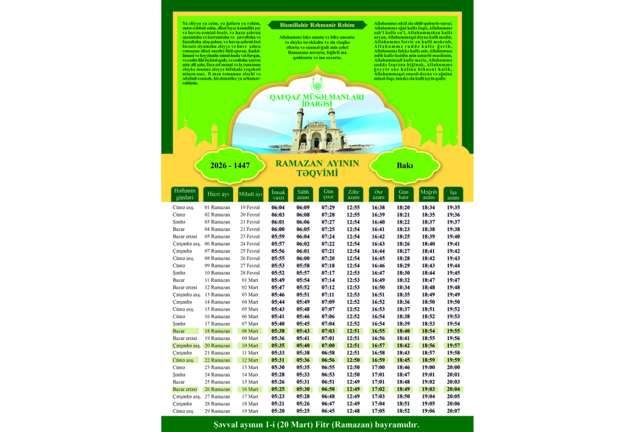 Qafqaz Müsəlmanları İdarəsi Ramazan ayının təqvimini açıqlayıb