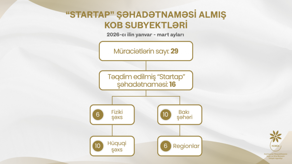 Yanvar-mart aylarında 29 mikro və kiçik sahibkar “Startap” şəhadətnaməsi almaq üçün Kiçik və Orta Biznesin İnkişafı Agentliyinə (KOBİA) müraciət edib.