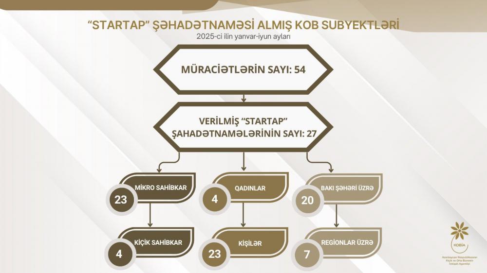 Azərbaycanda rəqəmsal iqtisadiyyatın müasir atributlarından biri olan startap ekosistemi biznes ideyalarının mükəmməl aləti kimi öz imkanlarını artırmaqdadır. “Startap Azərbaycan” platforması startaplar, investorlar, maliyyə fondları və gənc biznes komandasının təşviqinə səbəb olmaqdadır. Bunun nəticəsidir ki, uğurlu biznes layihəsi kimi startaplar kiçik və orta biznesin (KOB) marağında ön plana çıxır. 2025-ci ilin birinci yarısında 54 mikro və kiçik sahibkar “Startap” şəhadətnaməsi almaq üçün Kiçik və Orta Biznesin İnkişafı Agentliyinə (KOBİA) müraciət edib ki, Ekspertlər Şurası 27 biznes təmsilçisinin “Startap” şəhadətnaməsi ilə təmin edilməsinə razılıq verib. Şəhadətnamə almış sahibkarların 23-ü hüquqi, 4-ü fiziki şəxsdir. Onlardan 23-ü mikro, 4-ü isə kiçik sahibkarlıq subyektidir. “Startap” şəhadətnaməsi almış KOB subyektlərinin 20-si Bakı şəhərində, 7-si isə regionlarda fəaliyyət göstərir. Şəhadətnamə almış sahibkarların 4-ü qadındır.