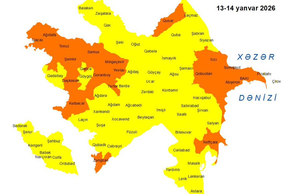 Milli Hidrometeorologiya Xidməti yanvarın 13-ü gündüzdən 14-ü axşamadək Bakıda və Abşeron yarımadasında, eyni zamanda, əksər bölgələrdə gözlənilən küləkli hava şəraiti ilə bağlı sarı və narıncı xəbərdarlıq verib.