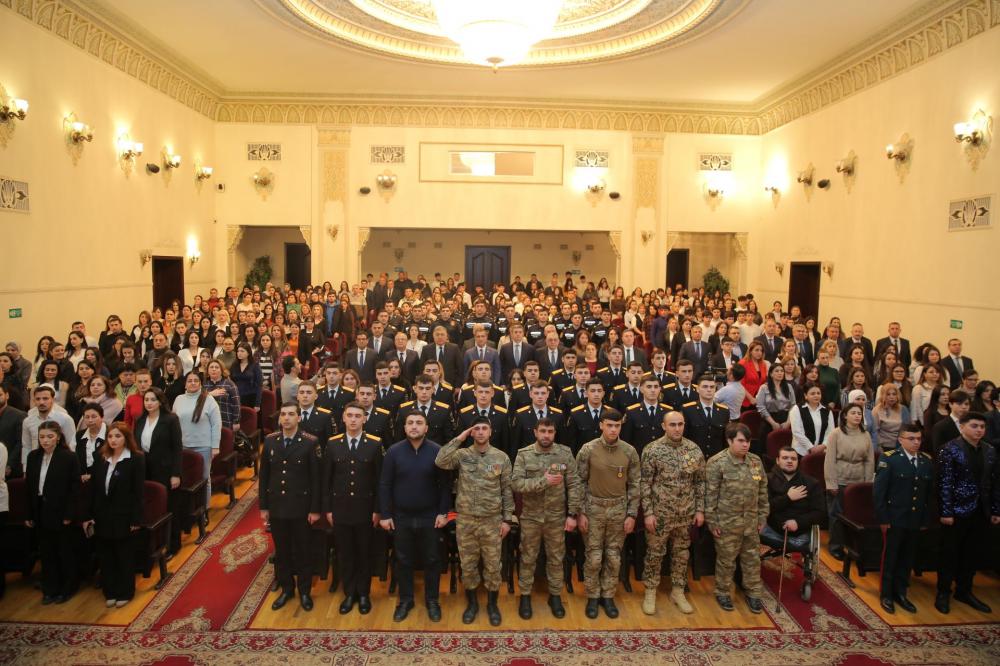 Daha sonra çıxış edən gənclər Bakı Ali Neft Məktəbinin tələbəsi Dautov Elnur və 125№li tam orta məktəbin şagirdi, “Heydər Əliyev və Azərbaycan tarixi” adlı referat müsabiqəsinin iştirakçısı İslamzadə Riyad müxtəlif sahələrdə uğur qazanan, özünü təsdiqləyən Azərbaycan gəncləri üçün ən həlledici sınaqlardan biri də sentyabrın 27-də başlayan və noyabrın 10-dək davam edən Vətən müharibəsi olduğunu bildirdilər. Rəşadətli Azərbaycan Ordusunun sıralarında Vətən uğrunda mətanətlə ön və arxa cəbhədə vuruşan qəhrəman gənclərimiz adlarını xalqımızın ən yeni tarixinə qızıl hərflərlə yazdılar. Məhz onların rəşadəti sayəsində əldə olunan bu Şanlı Zəfərlə Azərbaycanın ərazi bütövlüyü bərpa edildi, xalqımız otuz illik həsrətdən sonra tarixi torpaqlarımıza qovuşdu.