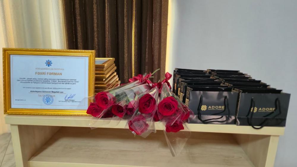 Sonda tədbirdə iştirak edən bir qrup qadın üzvlərimiz YAP Goranboy rayon təşkilatının həyata keçirdiyi tədbir və layihələrə verdikləri töhfələrə, o cümlədən "8 Mart Beynəlxalq Qadınlar Günü" münasibətilə və partiyanın ictimai-siyasi fəaliyyətində fəal iştiraklarına görə hədiyyə və Fəxri Fərmanla təltif olunmuşlar.
