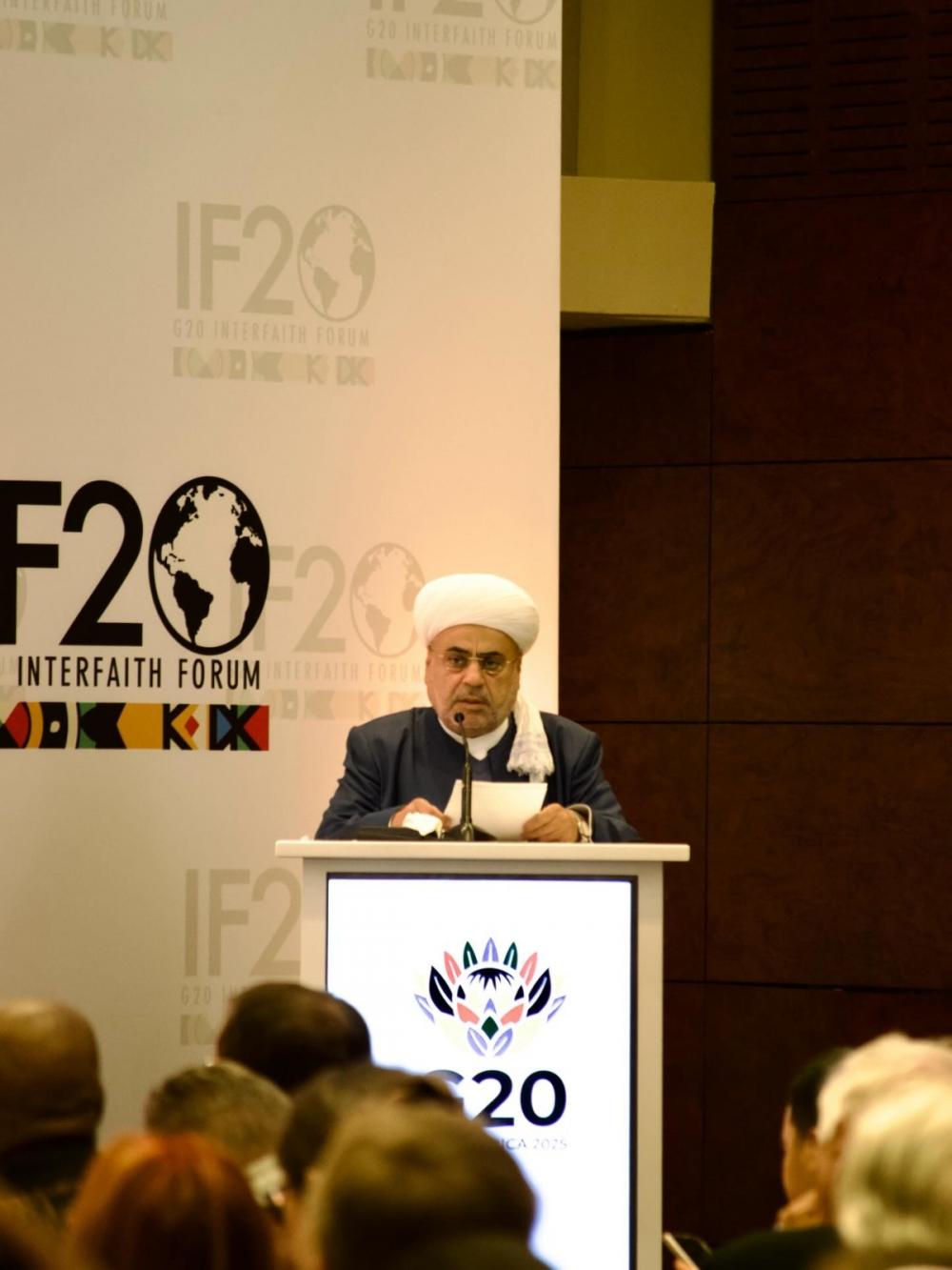 Avqustun 10-dan 14-dək Cənubi Afrika Respublikasının Keyptaun şəhərində G20 Dinlərarası Dialoq Forumu keçirilir. “Fəaliyyətdə humanizm: Həssas icmalar diqqət mərkəzində” mövzusuna həsr olunan Forumda Qafqaz Müsəlmanları İdarəsinin sədri Şeyxülislam Allahşükür Paşazadənin rəhbərliyi altında Azərbaycan nümayəndə heyəti də iştirak edir. Nümayəndə heyətinin tərkibinə Bakı Beynəlxalq Multikulturalizm Mərkəzinin icraçı direktoru Rəvan Həsənov, Mərkəzin icraçı direktorunun müavini Ramin Qəmbərov, Milli Məclisin deputatları Fazil Mustafa və Cavanşir Paşazadə daxildir.